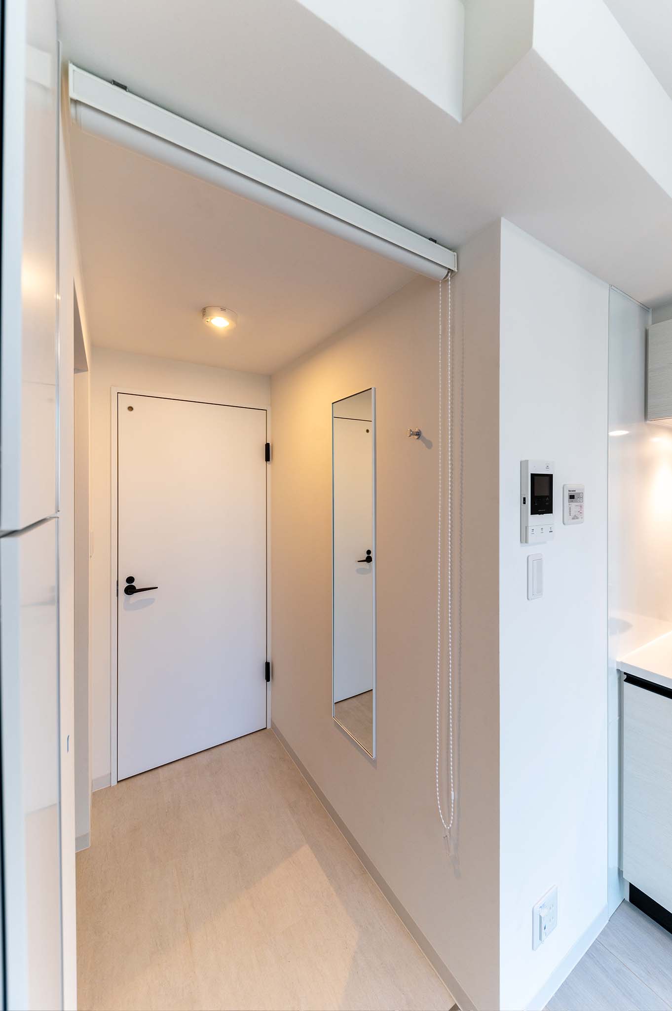The space is designed for residents to conveniently check their attire before heading out. Indoor hanging racks are also installed, allowing for flexible use of space and providing ample storage for single occupants.